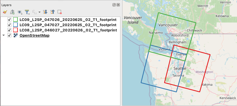 Click the Select Footprint button to add the footprint of the first three items to the QGIS canvas. The footprint map layer (simply an outline of the data’s extent) will be loaded into QGIS. Now, you can better see the spatial extent of this data.